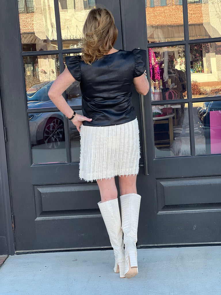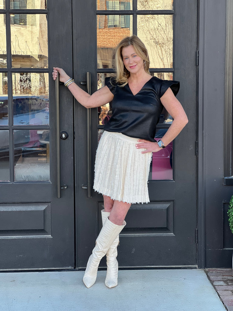 Elevate your look with this stunning leather like top! This top has the look of leather but the fabric is really soft and comfortable. Such an easy look to style classy or more on the edgy style.