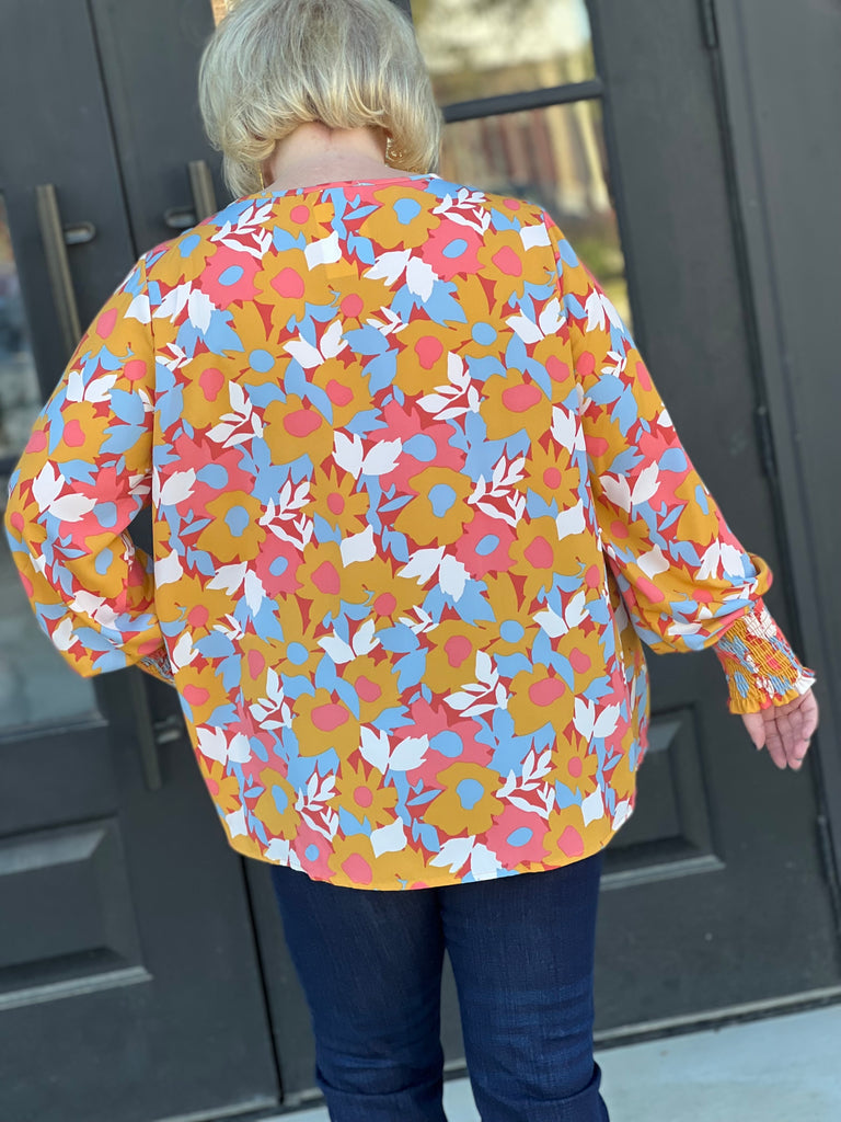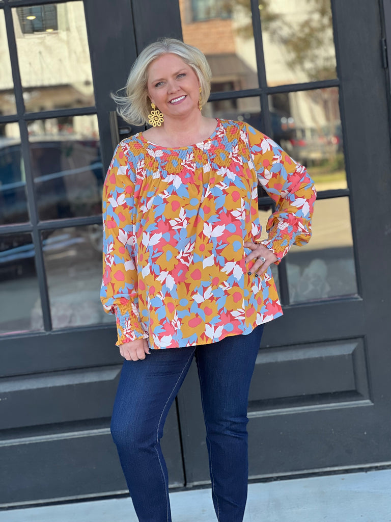If fall were a clothing item it would be this top! We are in love with all the colors this floral print top offers. The prettiest colors of fall in one print. This top features the most flattering style and fun style details.