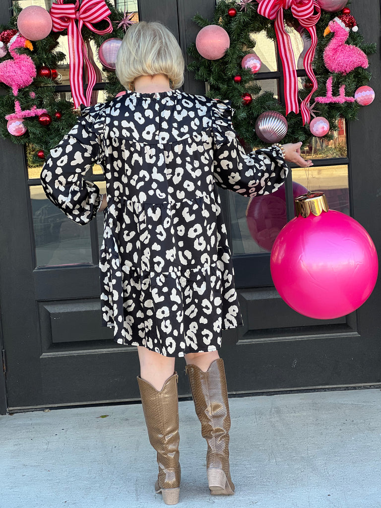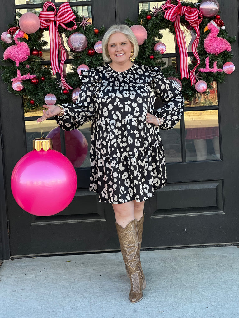Our Jumping In Dress is such a great style! This one will look so good! Features a gorgeous leopard print with the best ruffle detail.