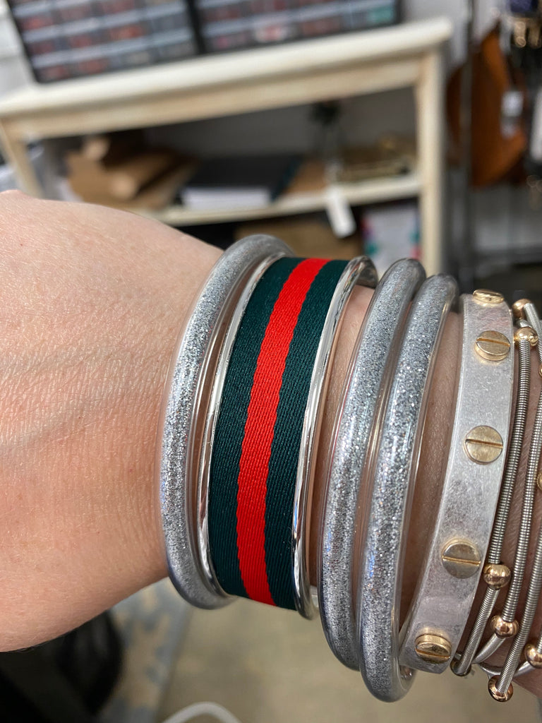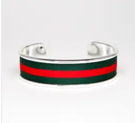 Turn heads in this amazing designer inspired red and green cuff with silver accents. Perfect for any look!