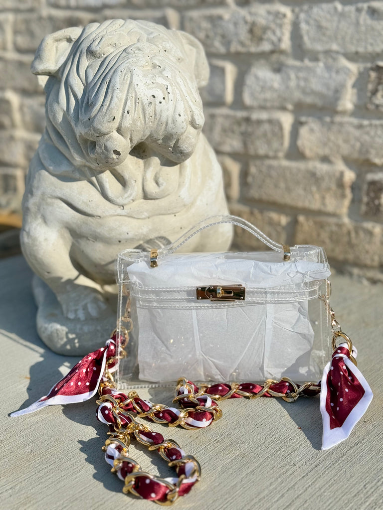 Get game day ready with The Junction Bundle! Featuring a Kelly mini clear purse and a chain scarf MS State themed purse strap, this ultimate bundle is perfect for senior gifts and more. Plus, it adds a touch of team spirit to your outfit. Go team! 🎉