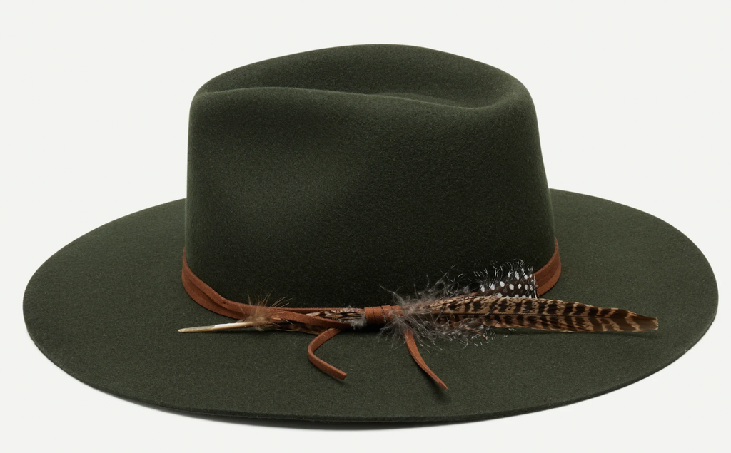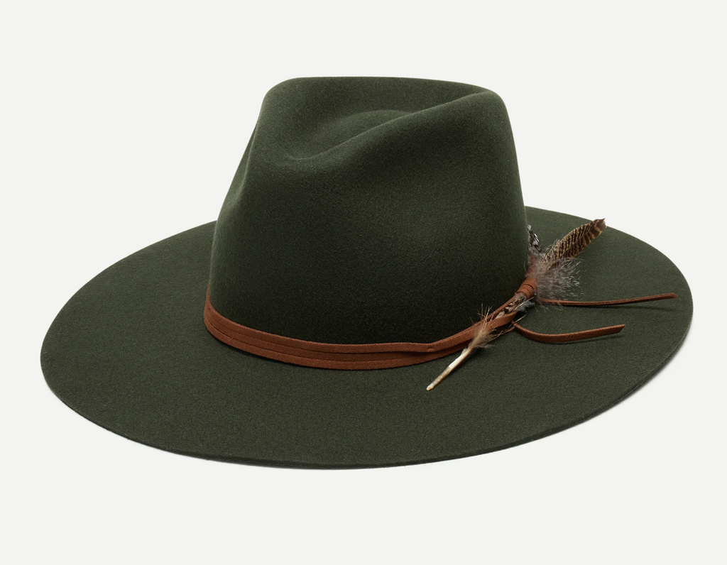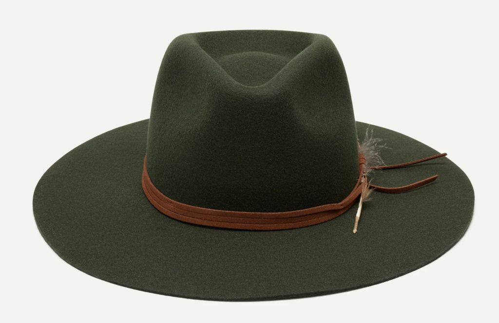 Hollis is a staff favorite! We love her feather and genuine leather trim, wide stiff cut brim, and high pinched crown. She's made of 100% Australian wool felt and we promise she'll get you lots of compliments.